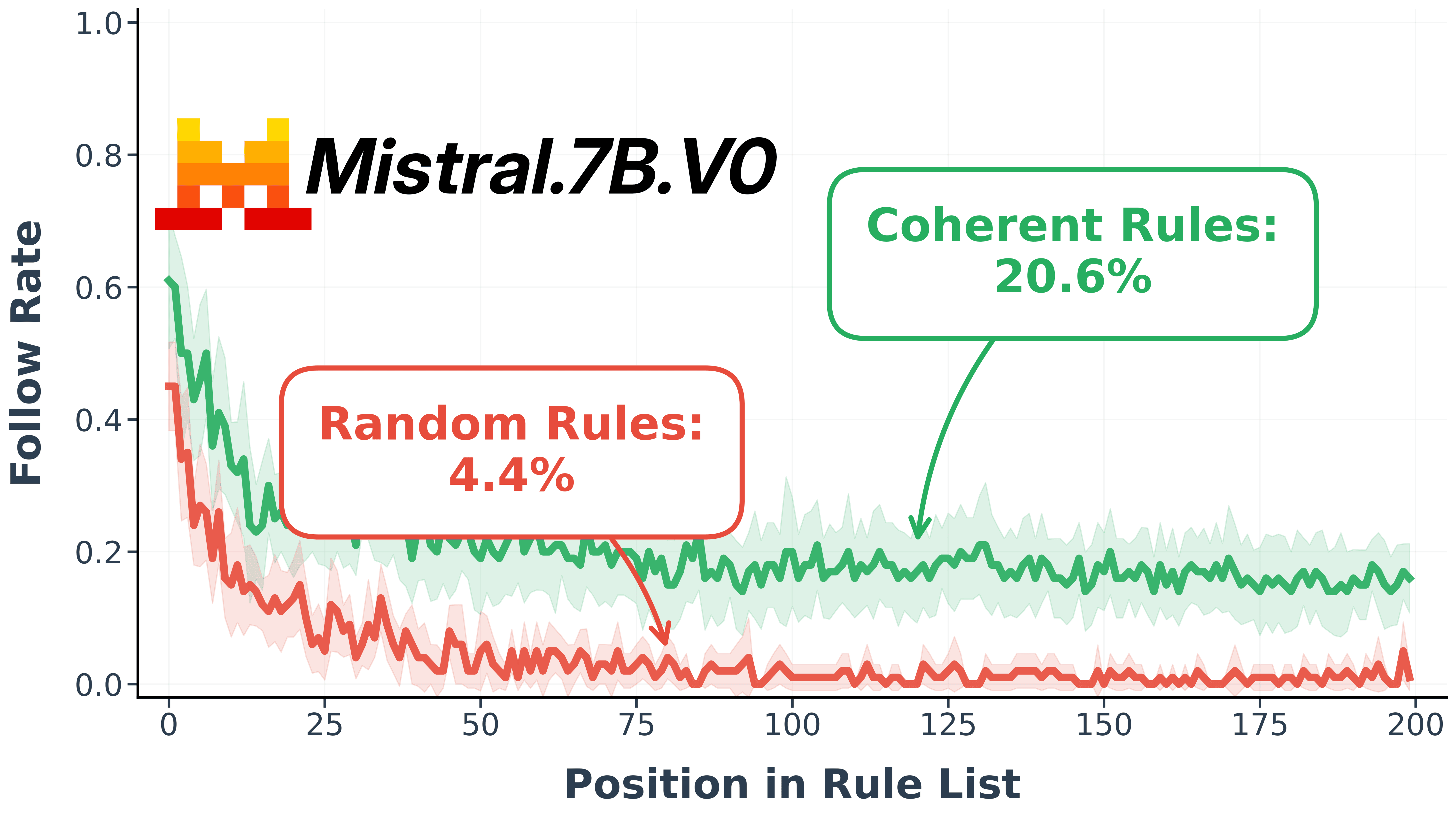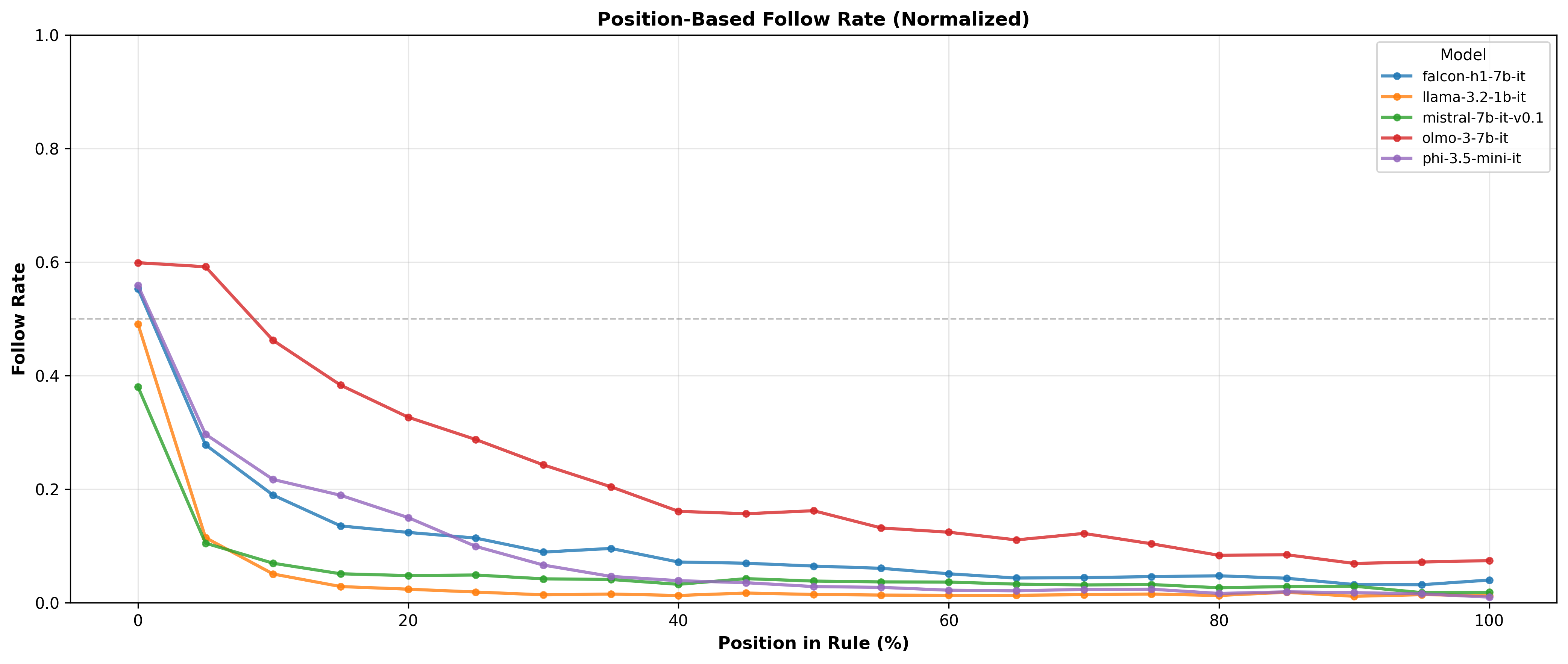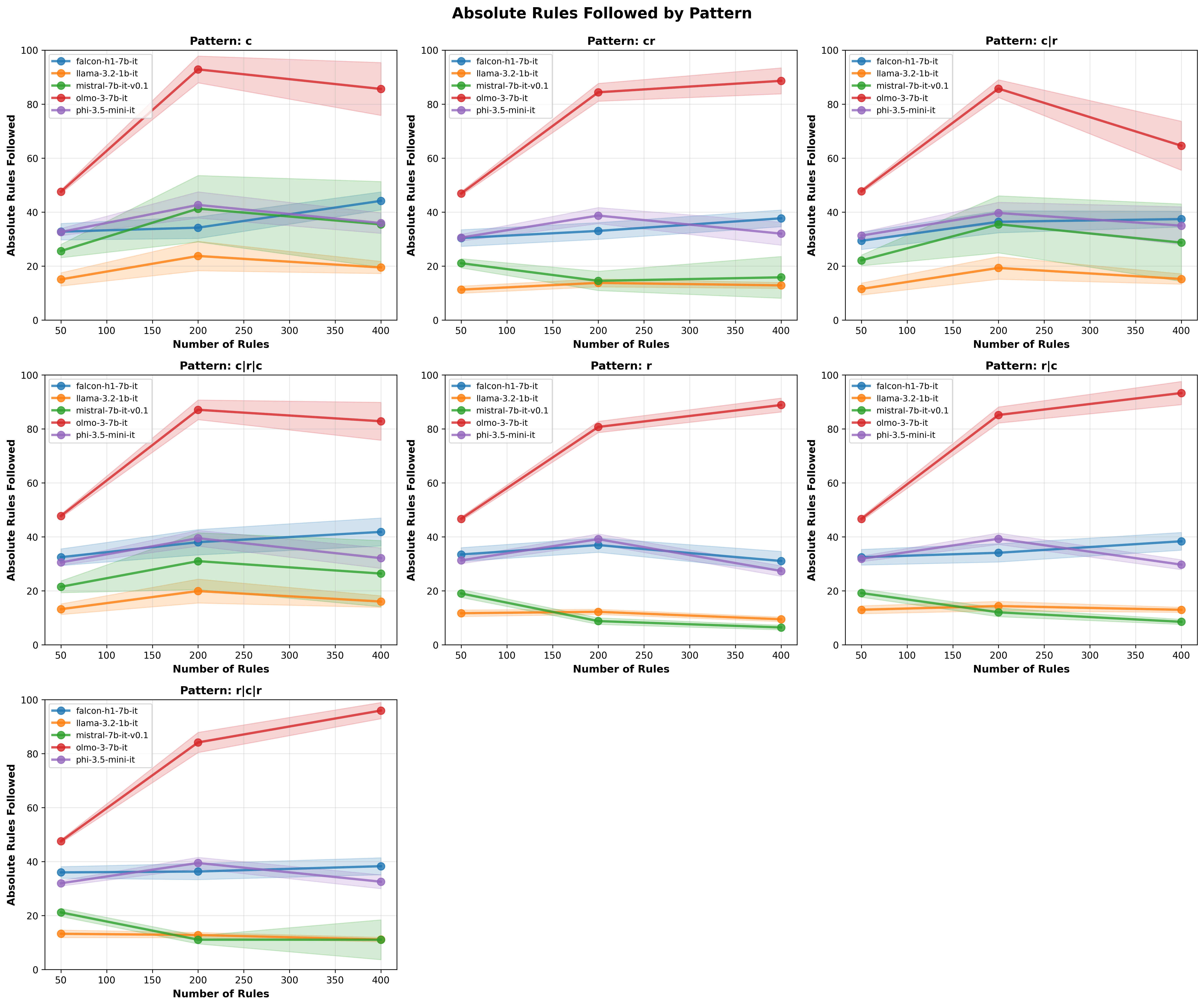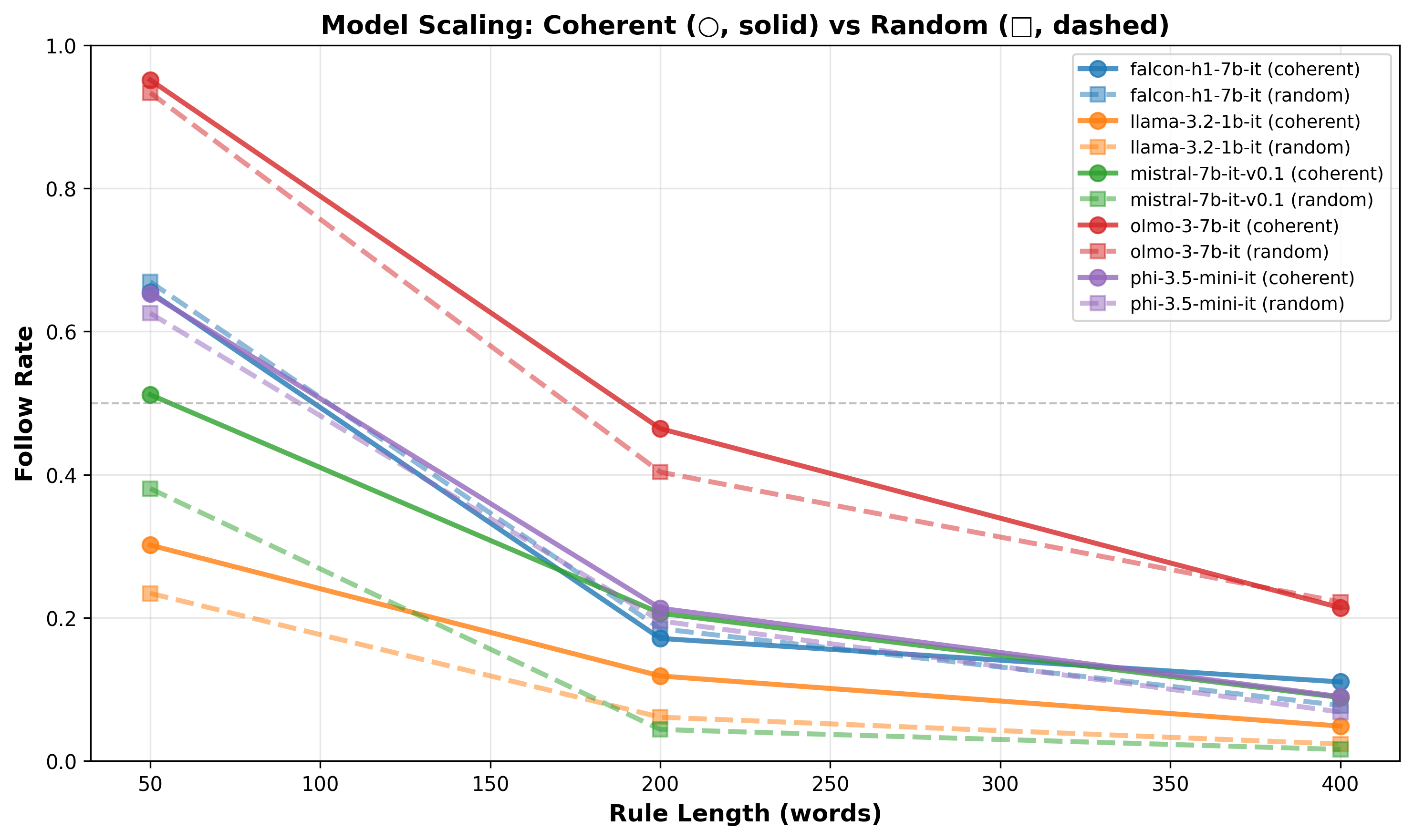At 50 rules, even the smallest model (Llama-3.2-1B) has some level of compliance (~25%) but at 400 rules it collapses to ~5%. Ai2’s Olmo-3-7B (7B parameters) achieves ~95% at 50 rules but crashes to ~24% at 400. Although Mistral.7B.V0 starts at ~43%, and Falcon-H1-7B at ~0.65, both drop to ~0.1 at 400 rules.
