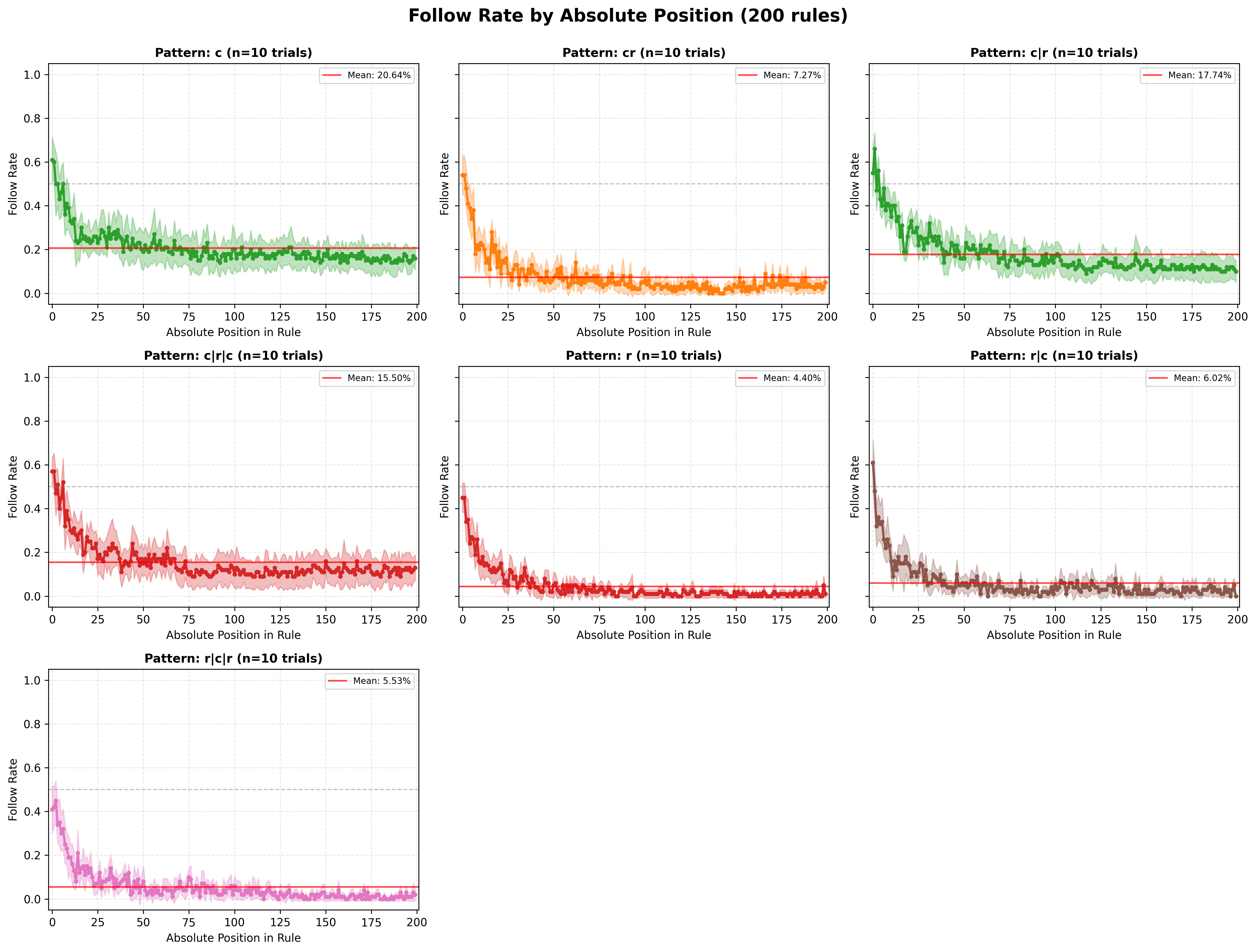 This is the core of the experiment. We know LLMs suffer from “Lost in the Middle” or positional biases (primacy/recency). If a model fails to follow a rule at index #350 of 400, is it because the context is too long, or because the rule is random?