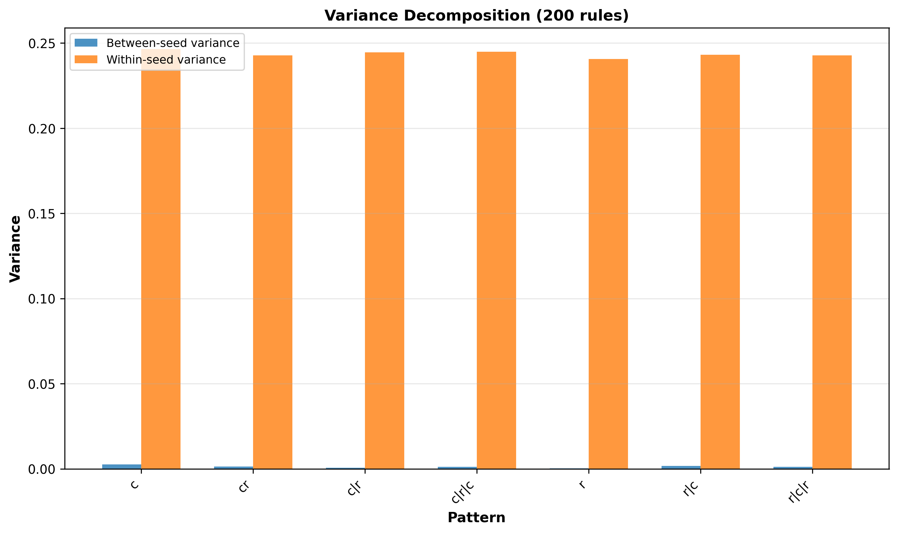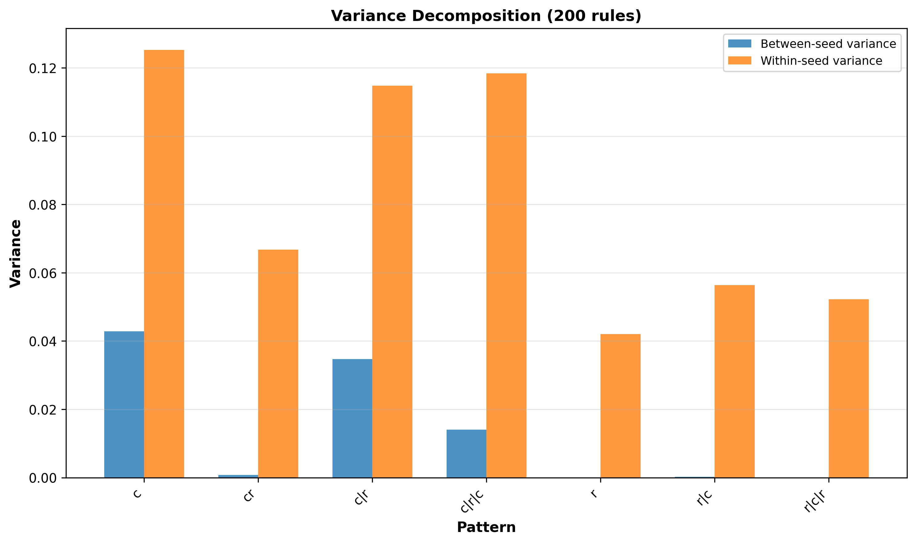 - The within-seed variance is much more present than between-seed variance. This holds across all patterns.