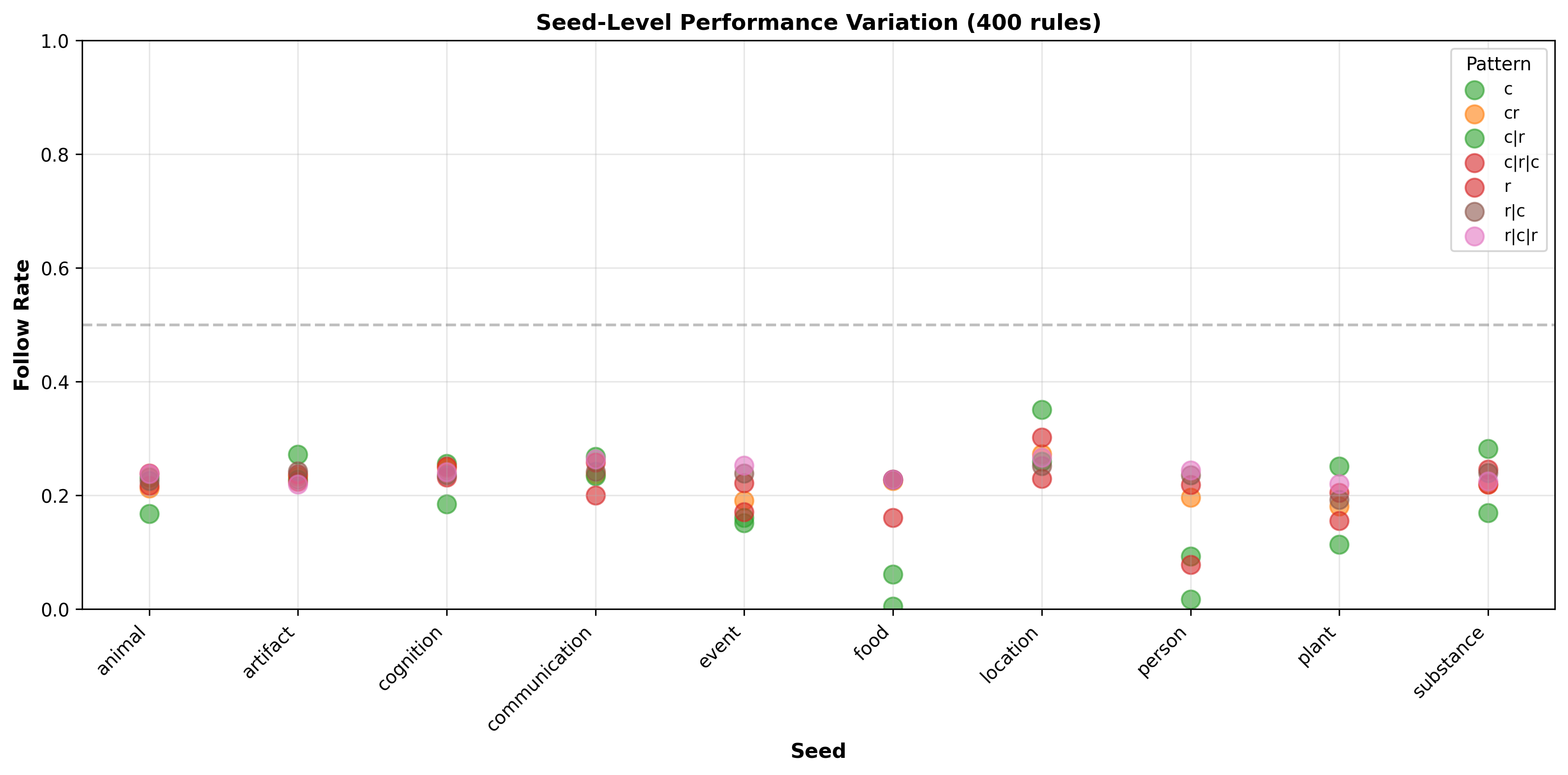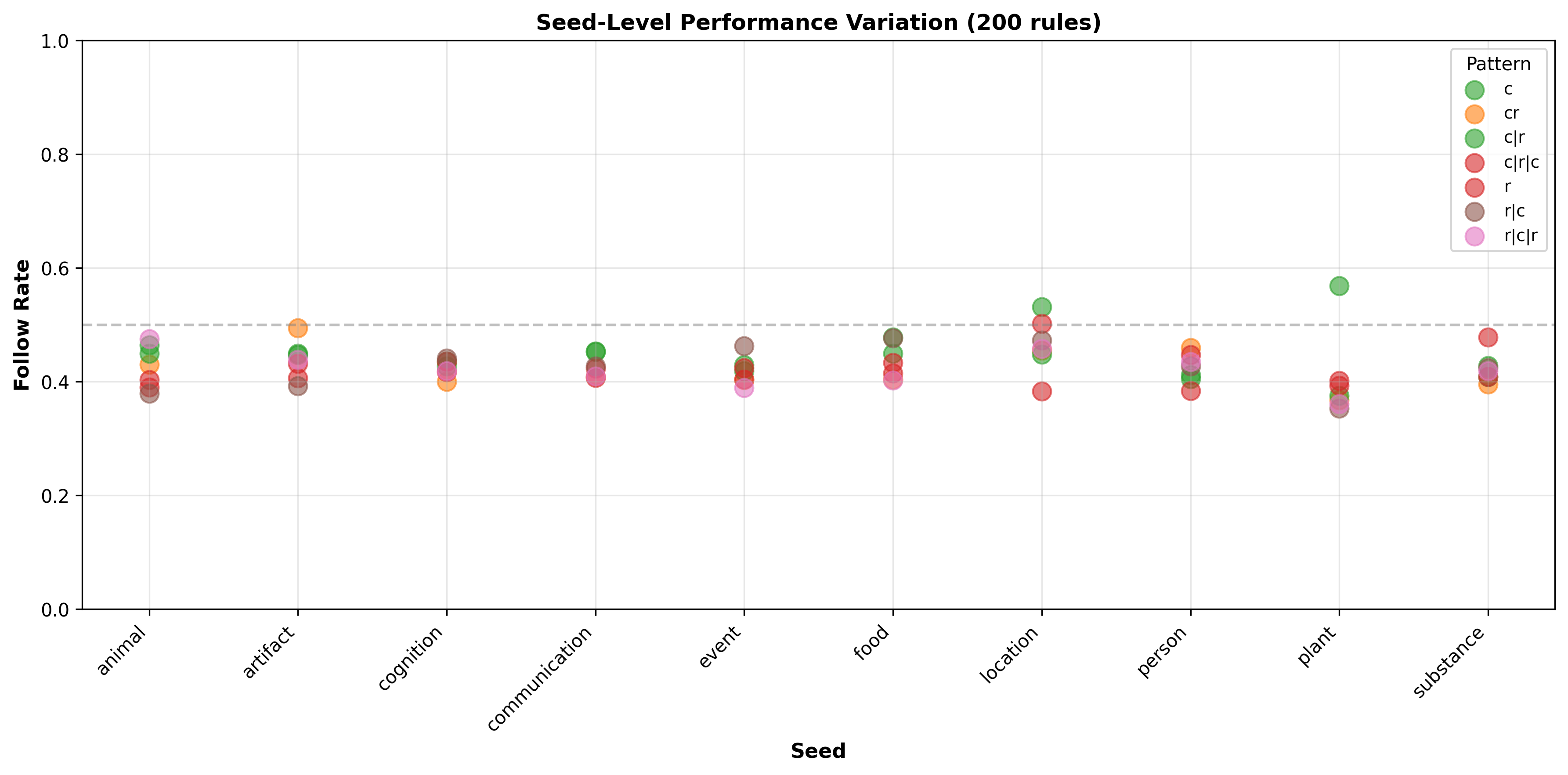 Model performance on 50 rules across different patterns collapsed under seed and variations