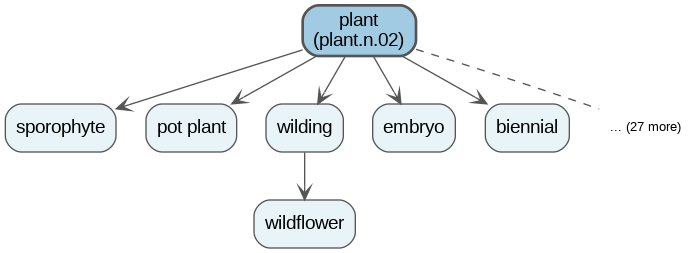 Using NLTK and WordNet, I wrote a word data generator that anchors to a specific synset seed. For example, if the seed is plant.n.02, the generator traverses the hyponym tree (the “is-a” relationships) to find all specific descendants of that concept.