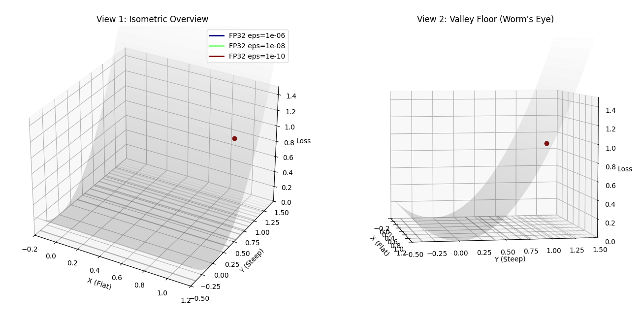My hypothesis was simple: The default eps=1e-8 creates a “floor” that acts as a brake on convergence for flat landscapes.