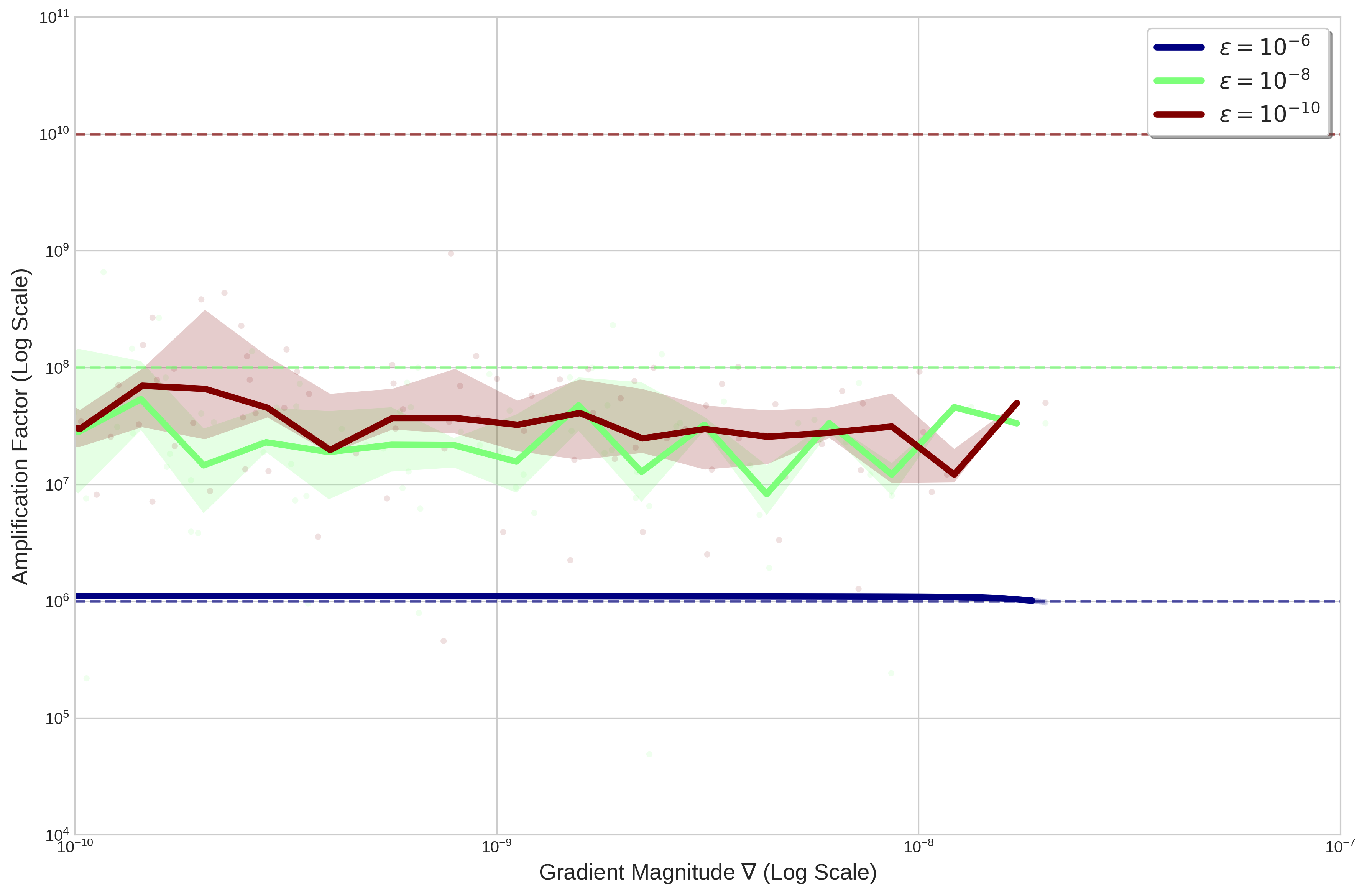 The Elevated Plateau (Red line, $10^{-10}$): The amplification reaches the highest levels, up to around $10^9$ in the observed data, but remains relatively flat without a clear increase as gradients get smaller. This allows Adam to maintain stronger boosts in flat regions compared to larger epsilons, though it still encounters practical limits short of its theoretical ceiling (dashed line at $10^{10}$, above the plot’s y-limit).