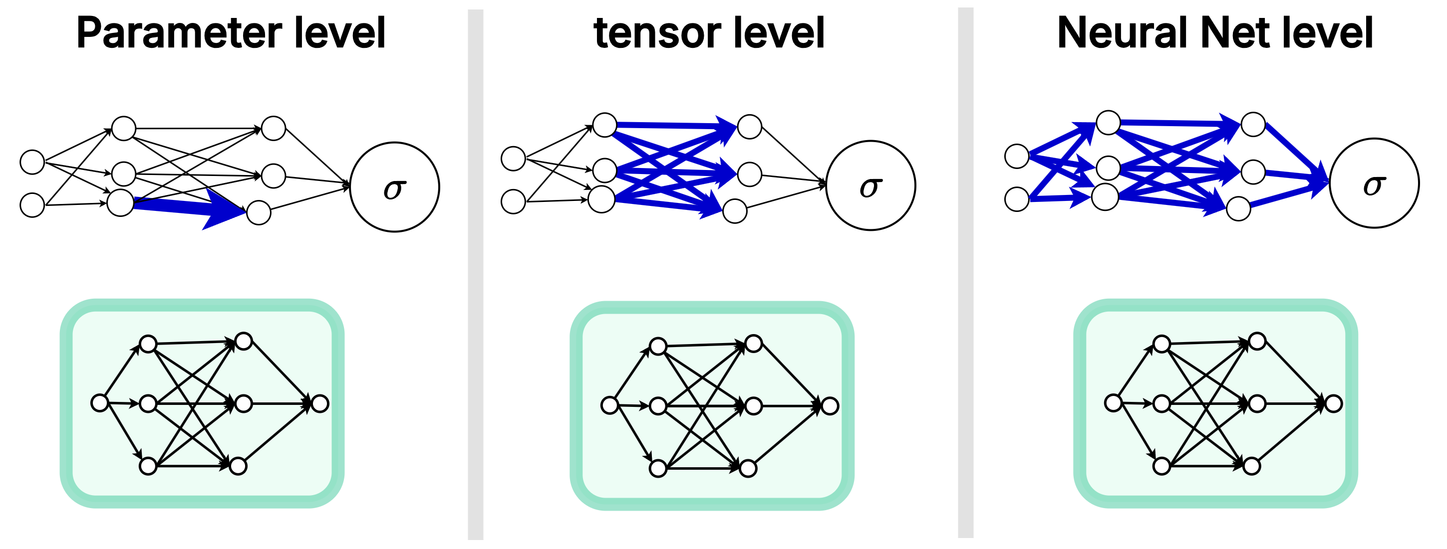 Now that we know how the optimizer is trained, how do we actually wire it up? This meta-optimization can be implemented at different levels of granularity: exclusively at the parameter level (coordinate-wise), inclusively at the tensor level, or even globally at the neural network level. Each approach comes with significant trade-offs in memory, compute, expressivity, and generalizability.