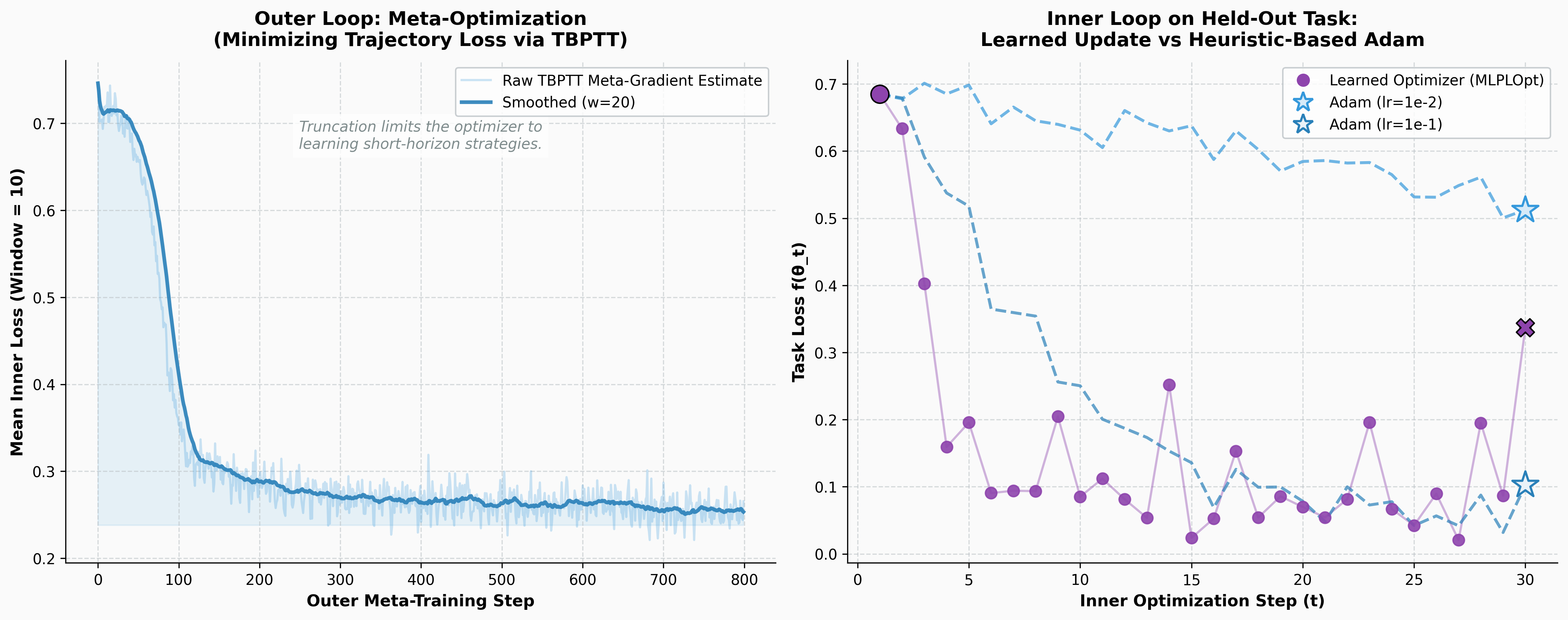 Left: The outer loop successfully minimizing the trajectory loss over 800 meta-training steps. Right: The inner loop on a completely unseen, held-out task. The learned optimizer exploits the landscape geometry to minimize the loss significantly faster than heuristic-based Adam.