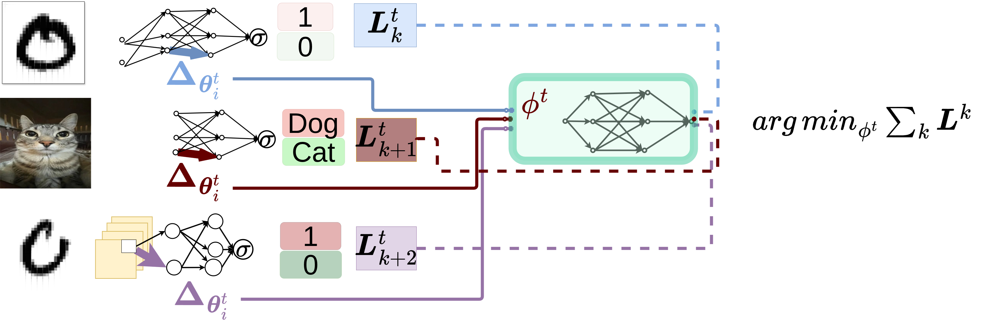 Let’s look back at our objective function: \(\mathcal{L}(\phi) = \mathbb{E}_f \left[ \sum_{t=1}^T w_t f(\theta_t) \right]\). Notice the expectation operator \(\mathbb{E}_f\) at the front. The optimizer isn’t just trying to minimize the trajectory loss for a single neural network on a single dataset. It is optimizing over a distribution of functions.