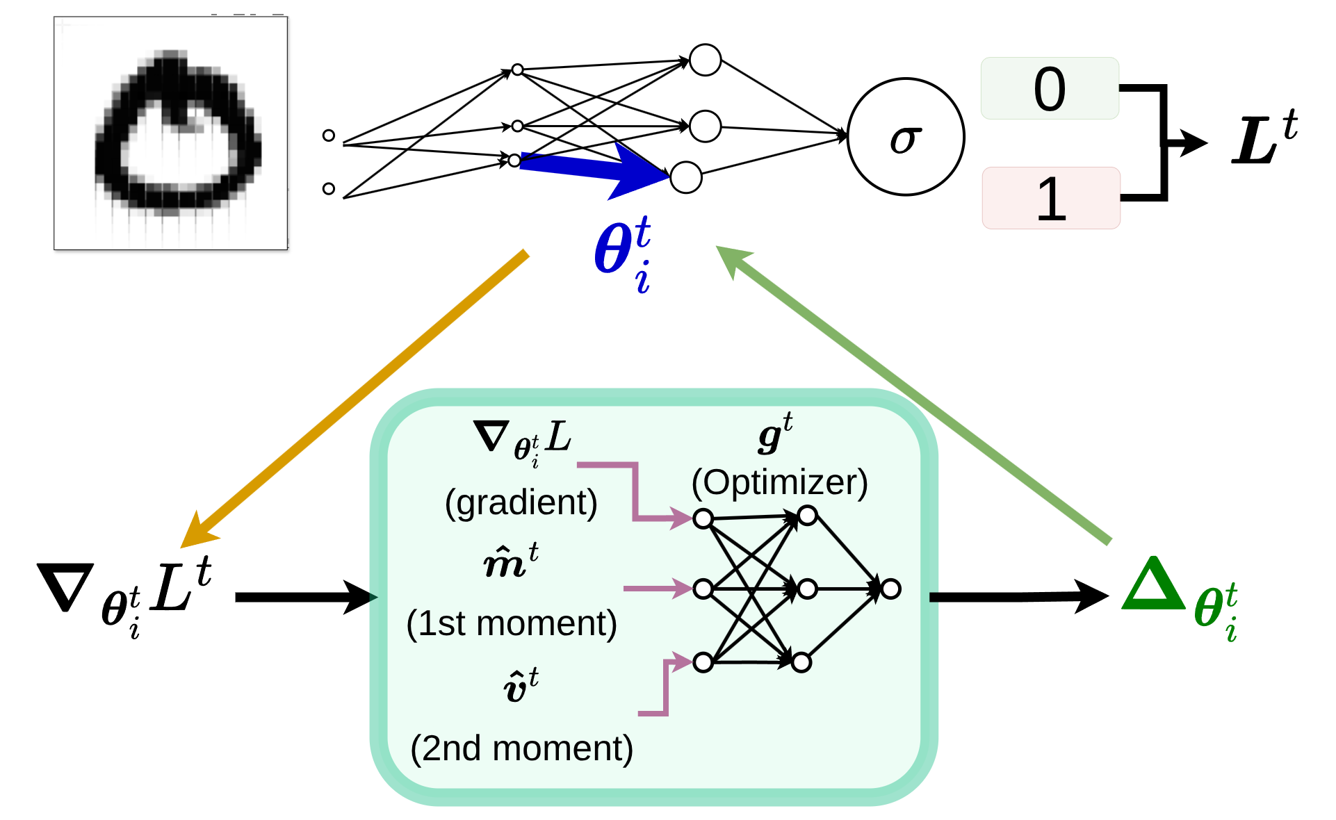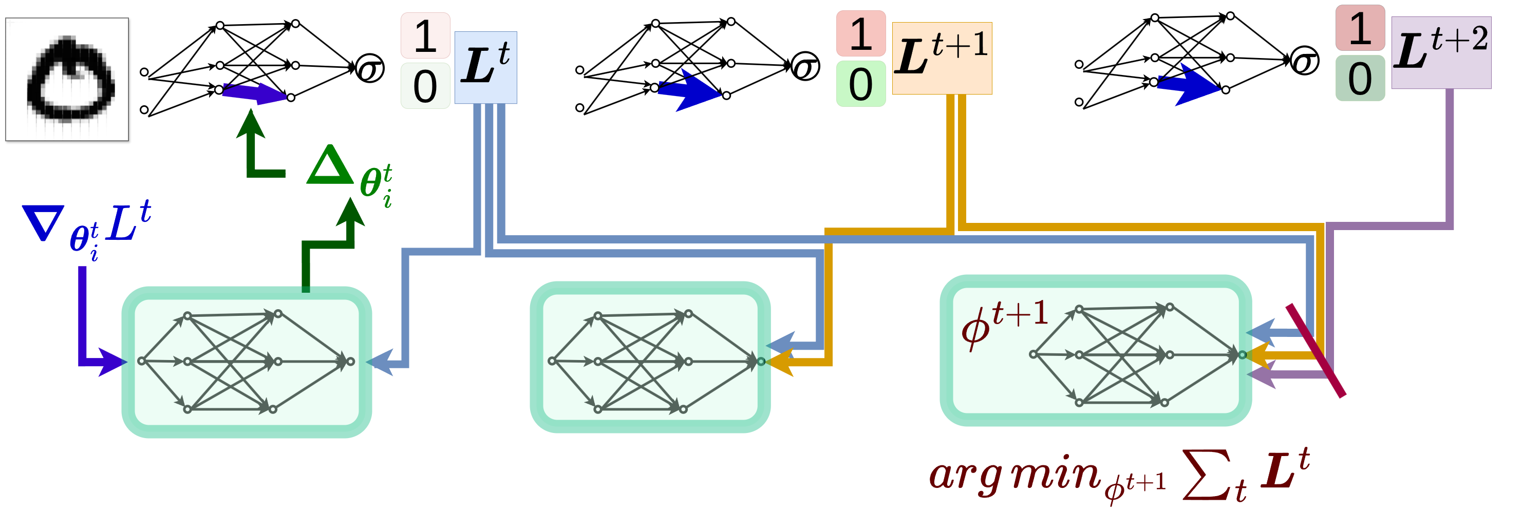 \[\theta_{t+1} = \theta_t + \underbrace{g_t(\nabla f(\theta_t), \phi)}_{\Delta \theta_i^t}\]