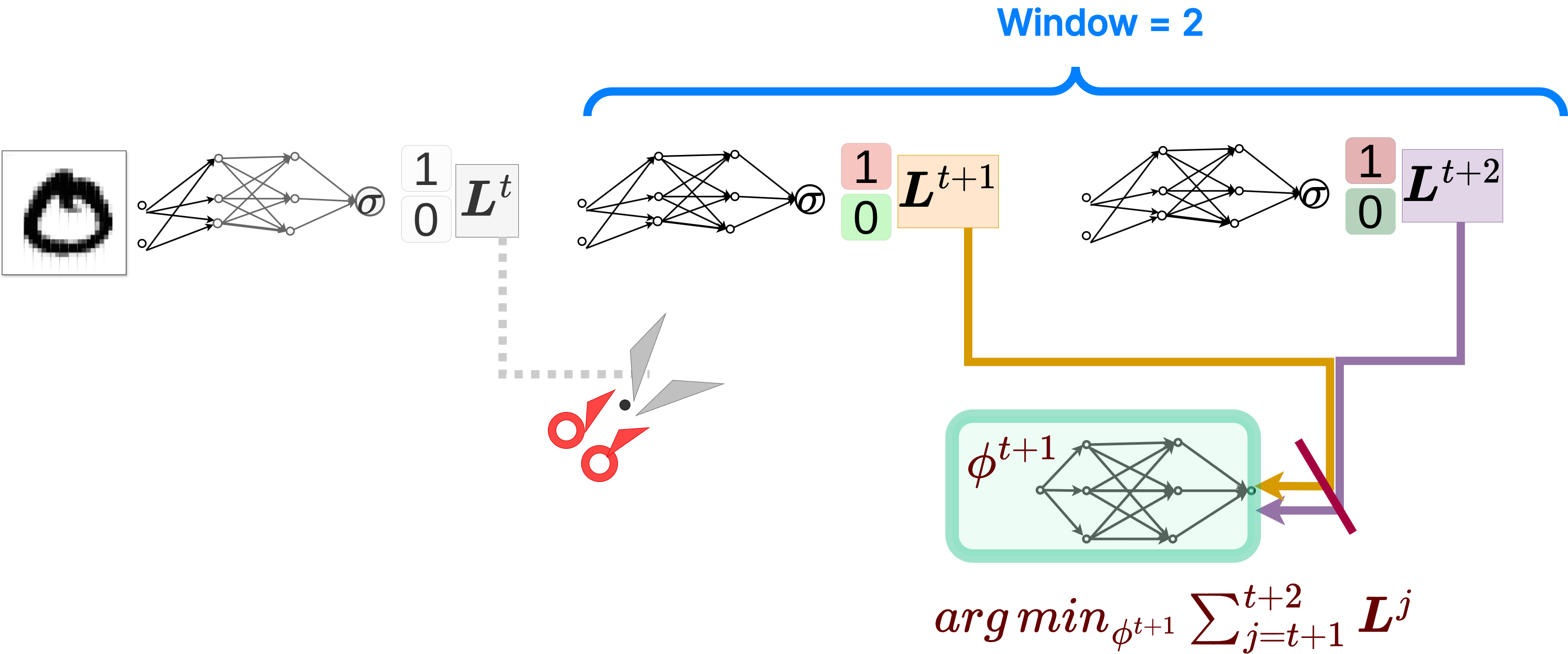 For simplicity, and without a loss of generalization, let’s assume our optimizer \(g\) takes in only the previous gradient \(\nabla_{t-1}\) and its weights \(\phi\):