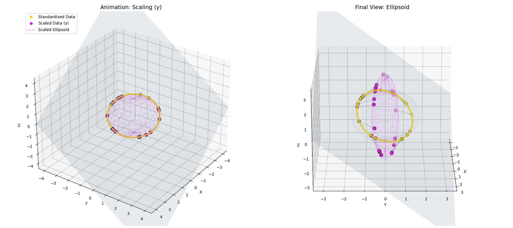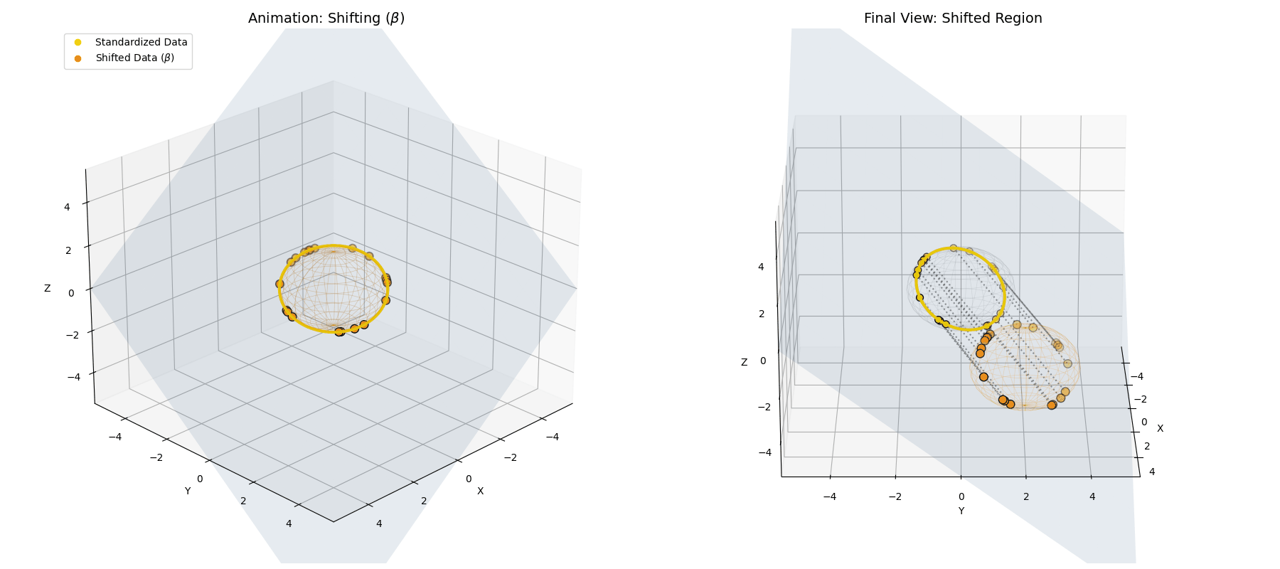 \[\vec{x}^{(3)} = \vec{g} \odot \vec{x}^{(2)} + \vec{b}\]Because $\vec{g}$ is applied via element-wise multiplication ($\odot$), it stretches our perfect sphere unevenly along the different feature axes, transforming the hypersphere into a hyper-ellipsoid. Then, adding the bias $\vec{b}$ simply picks up that ellipsoid and translates it through space.