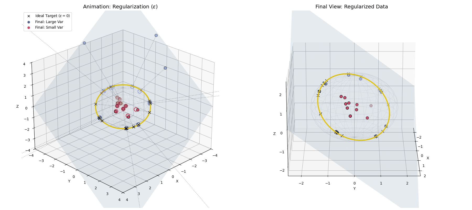 My goal here is to make this visually intuitive, so you’ll be able to manipulate these concepts in your head. I’ve built a 3D toy simulation to show exactly what happens to our data during standard LayerNorm, including the sneaky effect of the $\epsilon$ parameter (yes again! funny enough, I wrote about $\epsilon$ trapping the Adam optimizer, and here it is causing trouble again :p).