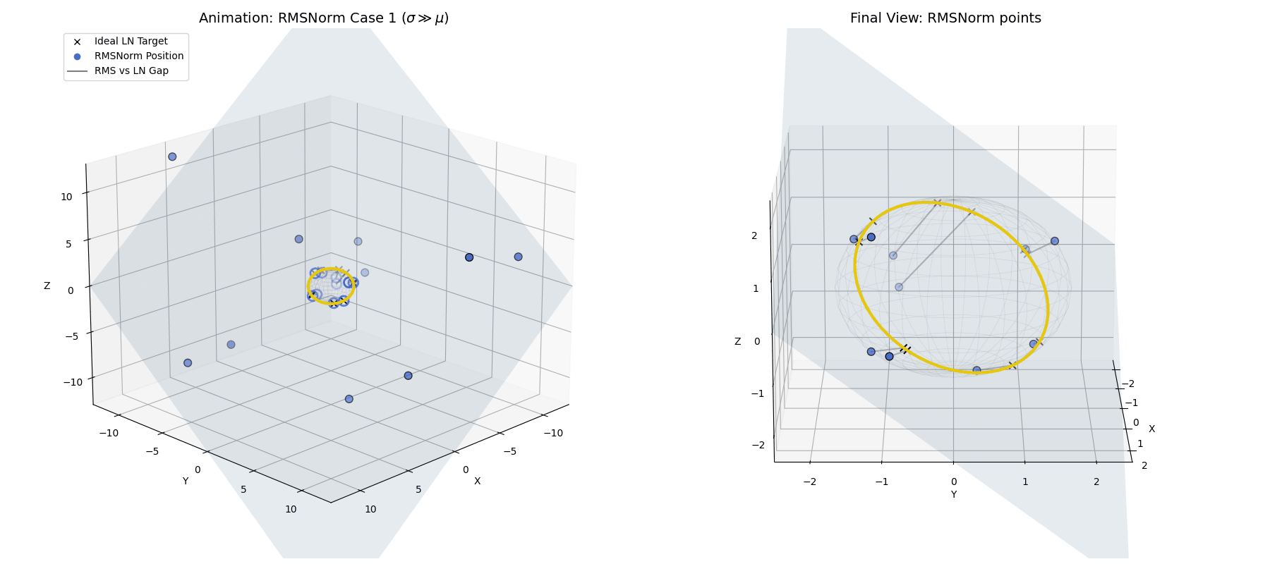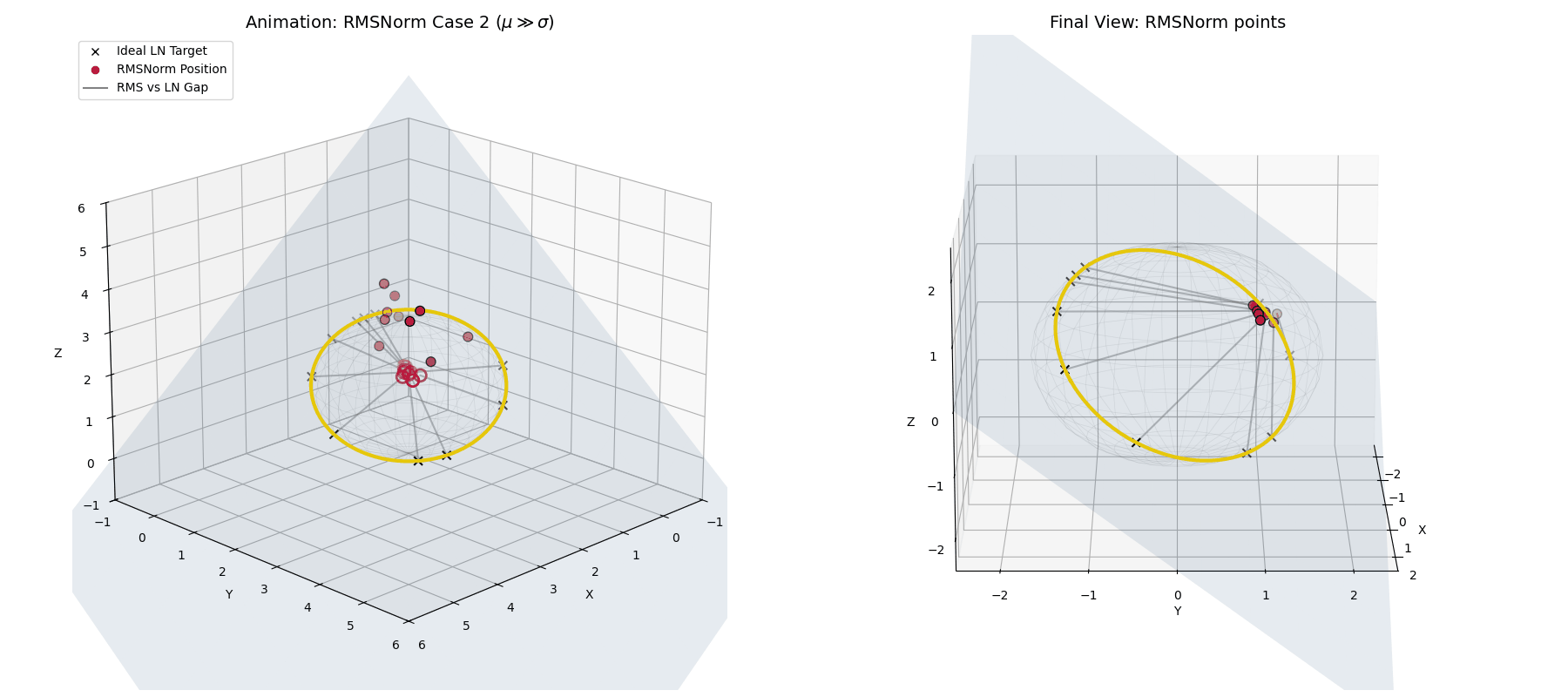 RMSNorm closely approximates standard LayerNorm. It doesn’t land exactly on the perfect LayerNorm target equator because we completely skipped the explicit centering step. However, because the standard deviation is so large, the data is widely spread out and lands very close to that ideal $\sqrt{n}$ spherical ring, achieving a highly similar geometric goal while saving compute.